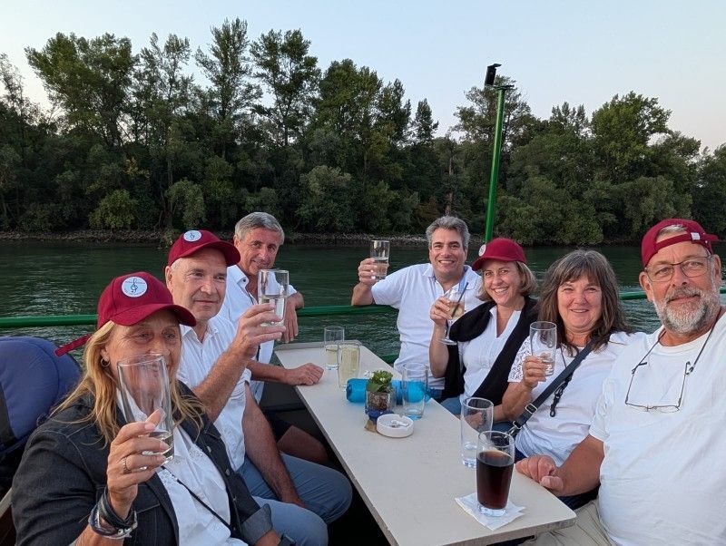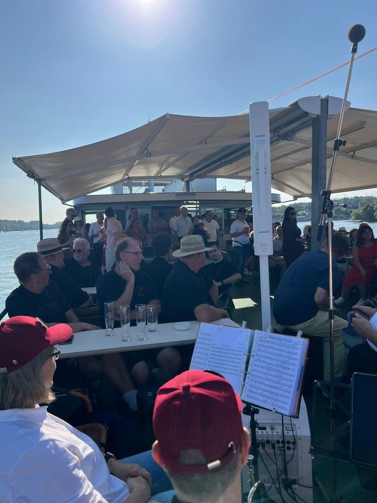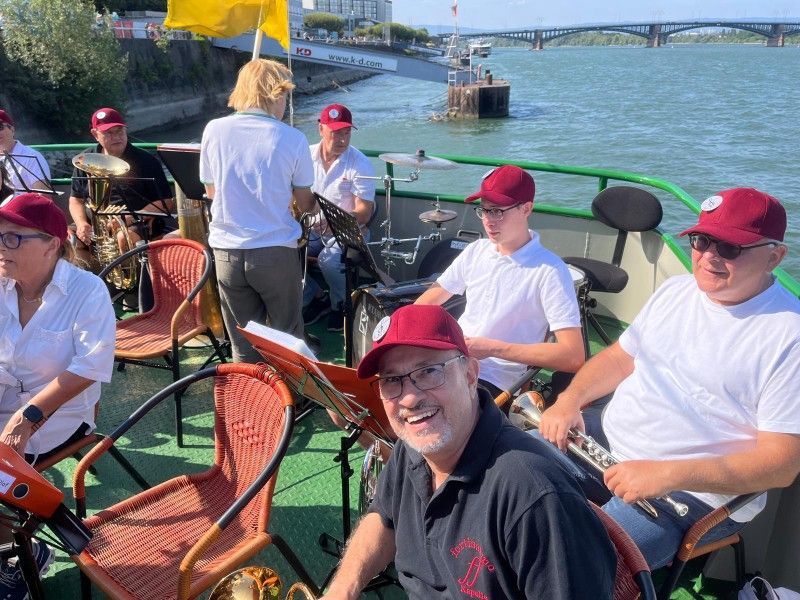 Eine Seefahrt die ist lustig, eine Seefahrt die ist schön … so war Idee unseres aktiven Mitgliedes Alexander Krüger. Am Samstag, den 16. August 2025 hatte er Alle aktiven Musikanten des MVA, anläßlich seines 60. Geburtstages, zu einer Schiffstour auf dem Rhein eingeladen. Pünktlich um 16:30h legte die „Robert Stolz“ (Name des Passierschiffes) in Mainz ab. Es ging dann Rheinabwärts bis Assmannshausen und danach wieder zurück zur Anlegestelle am Mainzer Fischtor. Natürlich hatten alle Musikkollegen ihre Instrumente mit an Board genommen und es folgte zunächst ein 2 stündiges Platzkonzert auf dem Rhein. Danach gab der MVA den „musikalische Stab“ weiter an die FF-Kapelle (Fortissimo Blas-Kapelle aus Raunheim). In beiden Orchestern spielt unser Alex das 1. Tenorhorn - an seinem Ehrentag war er allerdings hiervon befreit und kümmerte sich um seine Geburtstagsgäste so daß ihnen an nichts fehlte. Gegen 21:30h legten wir nach einem herrlichen Schiffstour wieder in Mainz an.
