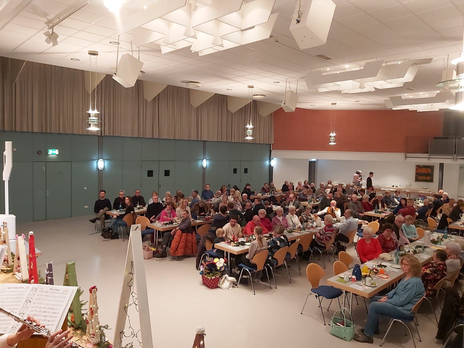 Wie auch im vergangenen Jahr wurde die Weihnachtsfeier nicht nur für die Vereinsmitglieder, sondern für alle Bürgerinnen und Bürger der Großgemeinde Trebur ausgerichtet. Diese fand am Nachmittag des 2. Advents im Bürgerhaus Astheim bei Kaffee, Kuchen und Musik statt. Erfreulich viele Personen waren der Einladung gefolgt. Letztlich konnten ca. 160 Gäste begrüßt werden. Die Tische und die Bühne waren festlich dekoriert. Ein großes Dankeschön geht hier an Rosi Knobbe, welche in liebevoller Handarbeit bereits Monate im Voraus mit den Bastelarbeiten startete und dem Aufbauteam für die Herrichtung des Saales.