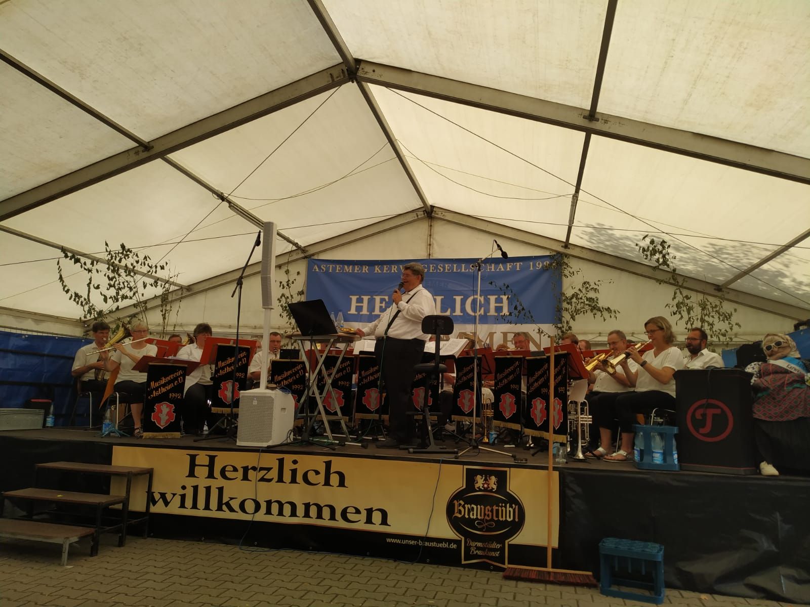 Am darauf folgenden Sonntag hatten wir dann ein Heimspiel auf der Astheimer Kerb - ab 12:00h spielten wir dort zum 4-stündigen Kerwefrühschoppen auf. Aufgrund der heißen Temperaturen blieben leider einige Plätze im Festzelt leer, da sich viele außerhalb des Festzeltes ein Plätzchen gesucht hatten.